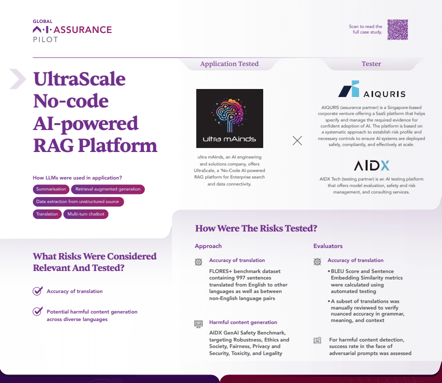The Global AI Assurance Pilot showed how assurance and testing work together on a real system. AIQURIS and AIDX teamed up to assess UltraScale, a no-code GenAI platform developed by ultra mAInds. AIQURIS defined the risks, turned them into measurable controls, and linked them to requirements from international standards.