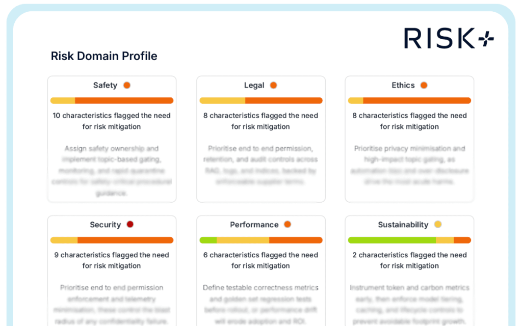 The AIQURIS Risk+ snapshot assessed inherent exposure before mitigation. Residual risk depends on how effectively controls are engineered and verified across the full architecture, including not only the permission layer, but also audit and monitoring, connector governance, data minimisation at indexing, response filtering, and incident response capability. Addressing authorisation drift is necessary. However, it is not sufficient on its own.